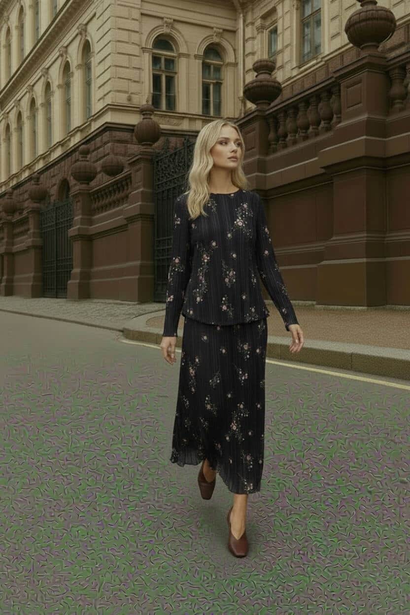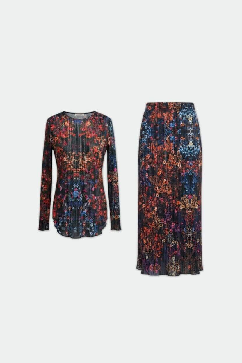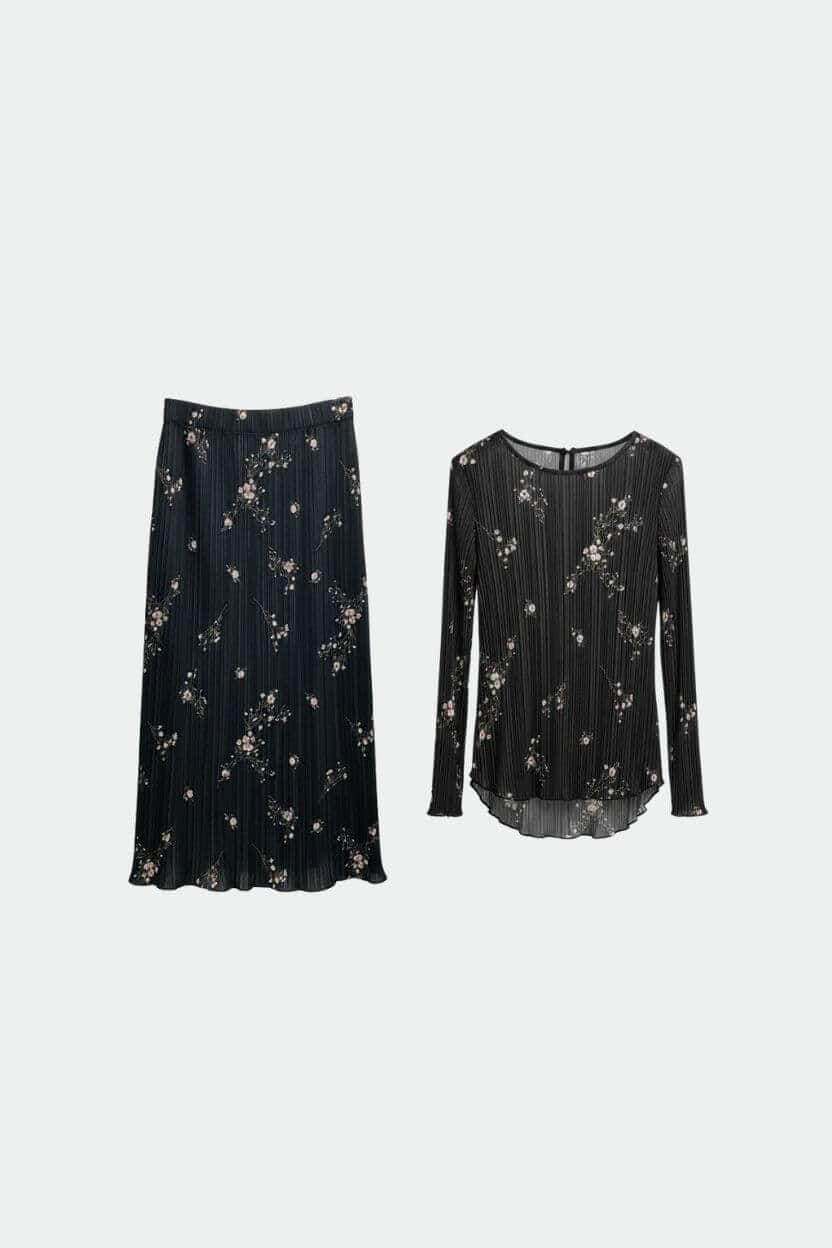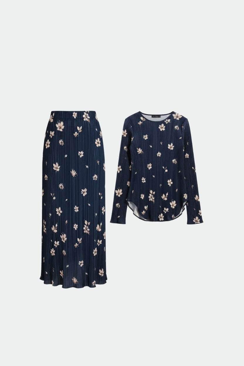 סט חולצה וחצאית,מבד פליסה דק, חולצה עם סיומת עגולה וחצאית ישרה.